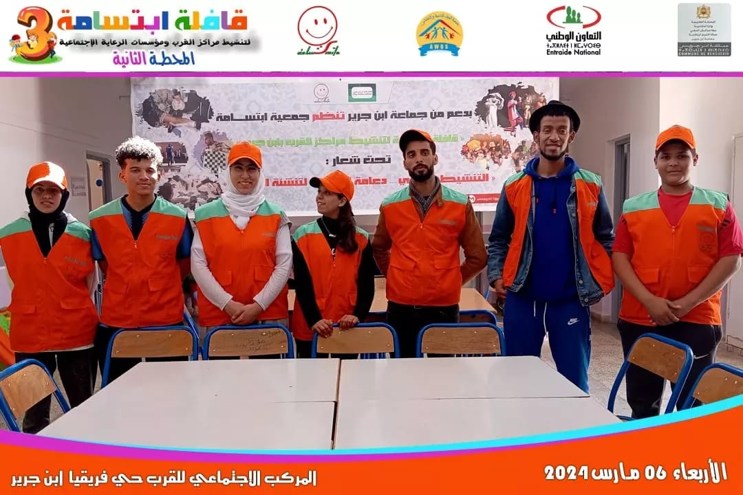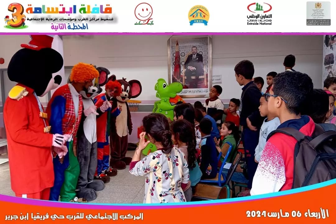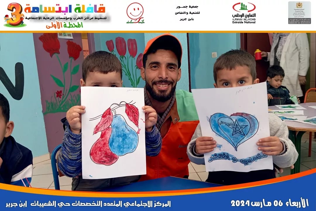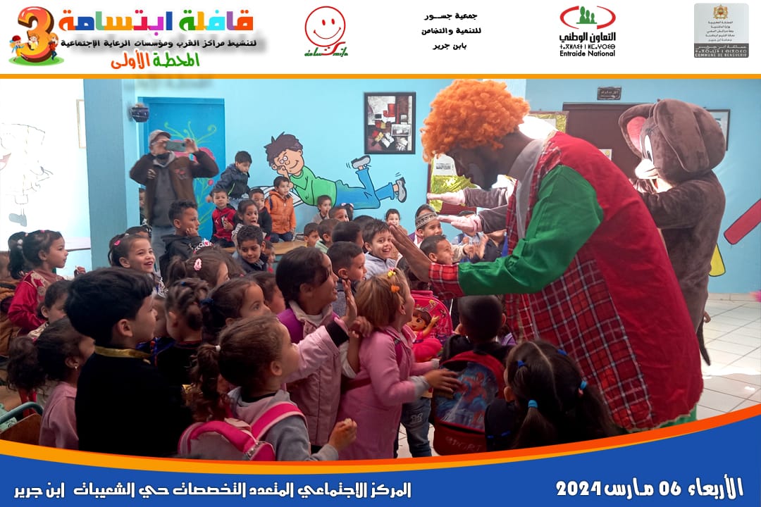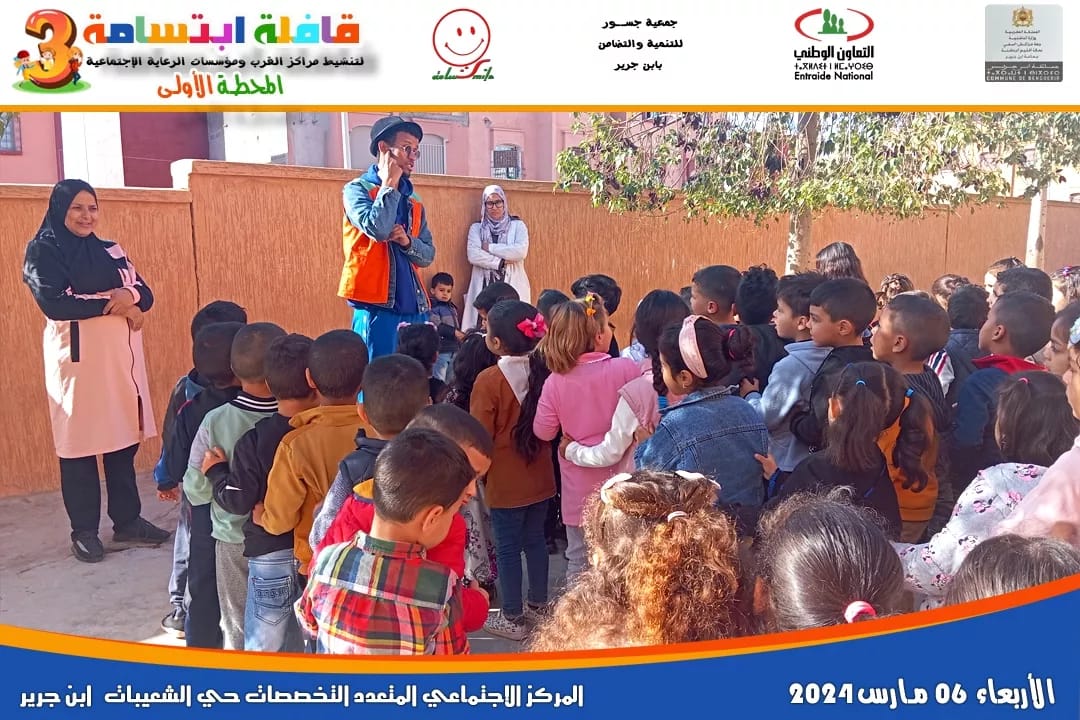تحت شعار ” التنشيط التربوي دعامة أساسية لتنشئة الطفل “، اطلقت جمعية ابتسامة يوم أمس الأربعاء 6 مارس 2024 قافلتها التربوية في نسختها الثالثة بدعم من جماعة إبن جرير، وبتنسيق مع المندوبية الإقليمية للتعاون الوطني بالرحامنة ، و كانت محطتها الأولى لتنشيط مراكز القرب ومؤسسات الرعاية الاجتماعية بإبن جرير من قلب المركز الاجتماعي متعدد الاختصاصات بالشعيبات بتنسيق مع جمعية جسور للتنمية و التضامن بإبن جرير صباحاً ،و بالمركز الاجتماعي للقرب بحي افريقيا بتنسيق مع جمعية الوفاء للتنمية والتضامن بإبن جرير مساءً.