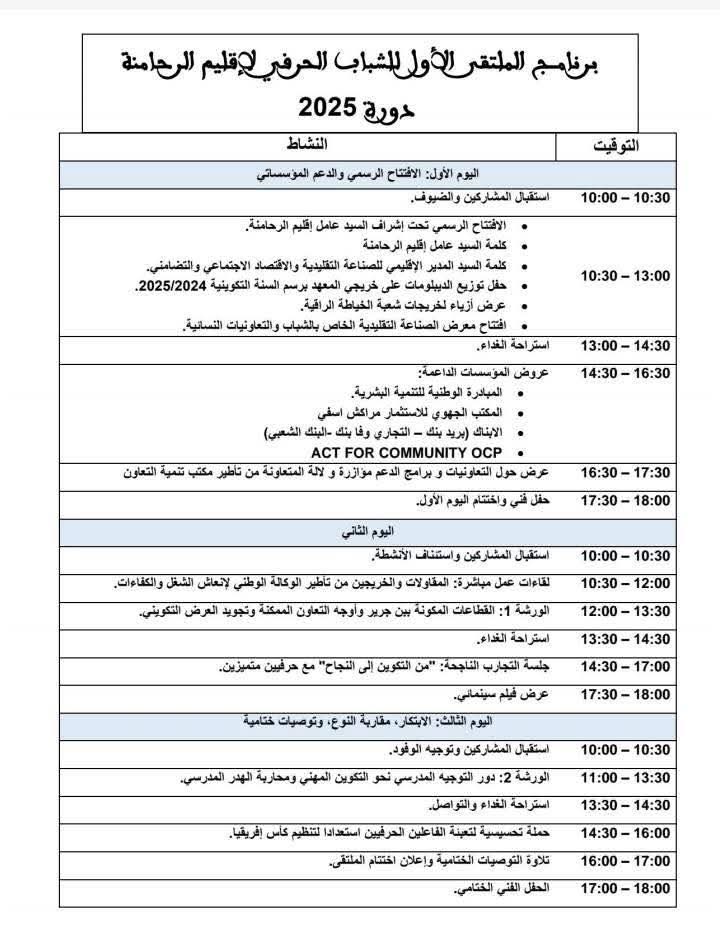 وسيتضمن برنامج الملتقى ورشات تطبيقية، عروض مهنية، لقاءات تواصلية، ومعارض تبرز نماذج من إبداعات الشباب في مختلف تخصصات الصناعة التقليدية، بما يعكس غنى هذا القطاع ودوره في خلق فرص الشغل.