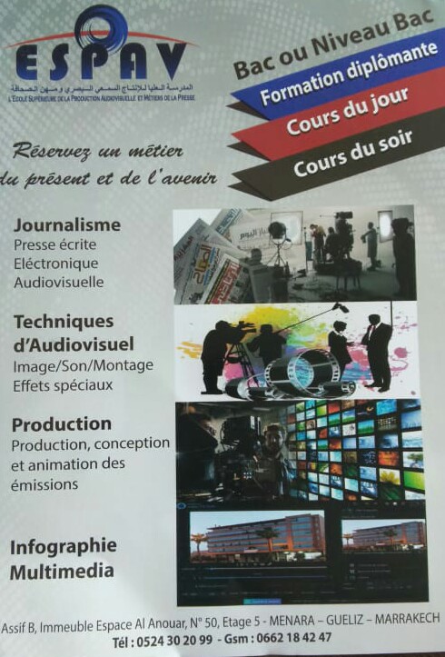 اثراء للمشهد الاعلامي المغربي ،ورغبة في تكوين وتخرج صحافيين بحمولات معرفية وتقنية جد مثمرة في ميدان الاعلامي ، وبمعايير دولية في الانتاج السمعي البصري والكتابة الصحفية الورقية والالكترونية ، تعززت المدينة الحمراء (مراكش ) بوجود مولود جديد في المجال الاعلامي للدخول المدرسي 2019 /2020 انها “المدرسة العليا للانتاج السمعي البصري ومواد الصحافة ” مشروع طموح سهر على اخراجه الى الوجود ثلث من الاساتذة المتمرسين والمشهود لهم بالتجربة والخبرة في الصحافة والاعلام “واهل مكة ادرى بشعابها ” المدرسة العليا الجديدة ستعتمد على منهاج بيداغوجي عصري يواكب اخر التطورات الحديثة العالمية ،سيكون له الاثر البالغ على الطالب ويجعله مؤهلا ليلج الى ميدان السلطة الرابعة او انشاء مقاولة صحافية بسلاسةواتزان سيكولوجي.للاتصال الهاتف موجود بالصورة اسفله: