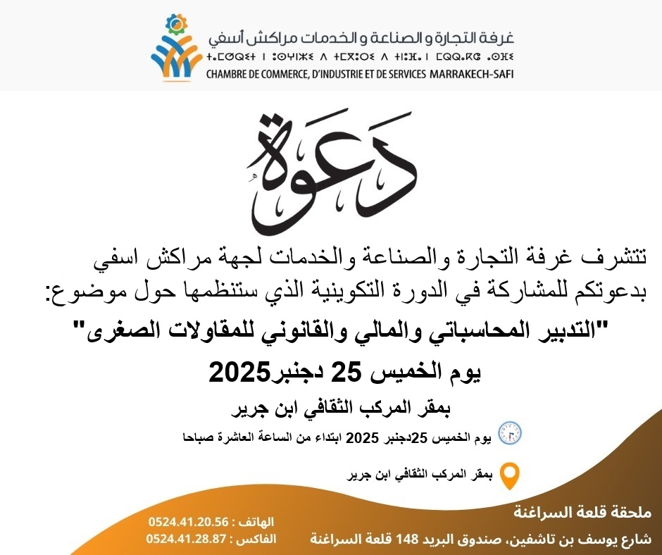 في بادرة نوعية لها اكثر من دلالة وتفرد وتحت شعار “التدبير المحاسباتي والمالي والقانوني للمقاولات الصغرى .تعتزم غرفة التجارة والصناعة والخدمات لجهة مراكش اسفي ،تنظيم دورة تكوينية لفائدة المقاولين و المهتمين بالمحال والتعريف به وكيفية انجاحه  للوصول الى مقاولة منتجة فاعلة مبنية على أسس قانونية و مالية صلبة ، الدورة يوم الخميس 25 دجنبر 2025 انطلاقا من العاشرة صباحا بالمركب الثقافي بابن جرير .