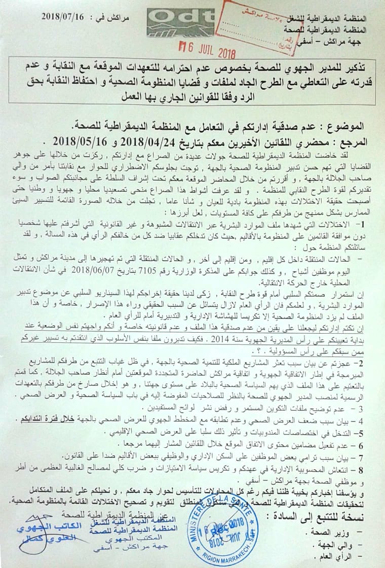 المدير الجهوي للصحة بمراكش اسفي يفشل من جديد  في ادارة الحوار الاجتماعي والمنظمة الديمقراطية للصحة تبعث اليه بتذكير!