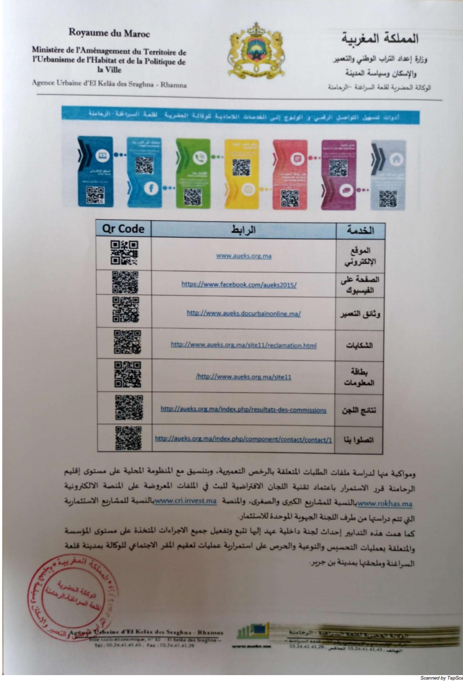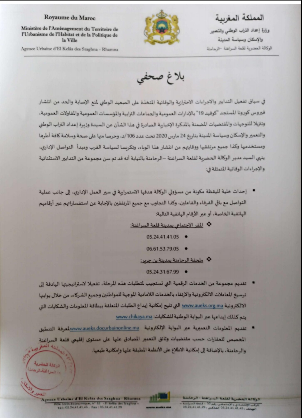 في سياق تفعيل التدابير والاجراءات الاحترازية والوقائية المتخذة على الصعيد الوطني لمنع الاصابة والحد من انتشار فيروس كورونا المستجد “كوفيد 19 “بالادارات العموميةوالجماعات الترابيةو المؤسسات العمومية والمقاولات العمومية، وتنزيلا للتوجهات والمقتضيات المضمنة بالمذكرة الاخبارية الصادرة في هذا الشأن عن السيدة وزيرة إعداد التراب الوطني والتعمير و الاسكان و سياسة المدينة بتاريخ 24 مارس2020 تحت عدد 106/د، وحرصا منها على صحة وسلامة كافة أطرها و مستخدميها وكذا جميع مرتفقيها ووقايتهم من انتشار هذا الوباء، وتكريسا لسياسة القرب ومبدأ التواصل الاداري، ينهي السيد مدير الوكالة الحضرية لقلعة السراغنة –الرحامنة بالنيابة،انه قد تم سن مجموعة من التدابير الاستثنائية والاجراءات الوقائية المتمثلة في: ▪ إحداث خلية لليقظة مكونة من مسؤولي الوكالة هدفها الاستمرارية في سير العمل الاداري، إلى جانب عملية التواصل مع باقي الفرقاء والفاعلين، وكذا التجاوب مع جميع المرتفقين بالاجابة عن استفساراتهم عبر أرقامهم الهاتفية الخاصة، أو عبر الارقام الهاتفية التالية: ❖ المقر االجتماعي بمدينة قلعة السراغنة: 05.24.41.41.05 • 06.61.53.79.05 • ❖ ملحقة الرحامنة بمدينة بن جرير: 05.24.31.67.99 • ▪ تقديم مجموعة من الخدمات الرقمية التي تستجيب لمتطلبات هذه المرحلة، تفعيلا لاستراتيجيتها الهادفة إلى ترسيخ المعاملات الكترونية والارتقاء بالخدمات اللامادية الموجهة للمواطنين وجميع الشركاء، من خلال بوابتها الإلكترونية www.aueks.org.ma التي تتيح إمكانية إيداع الطلبات المتعلقة ببطاقة المعلومات والشكايات التي يتم كذلك إيداعها عبر البوابة الوطنية للشكايات: www.chikaya.ma . ▪ تقديم المعلومات التعمير ية عبر البوابة الإلكترونية www.aueks.docurbainonline.ma لمعرفة التنطيق المخصص للعقارات حسب مقتضيات وثائق التعمير المصادق عليها على مستوى إقليمي قلعة السراغنة والرحامنة، بالإضافة إلى إمكانية الاطلاع على الانظمة المطبقة عليها وإمكانية طبعها