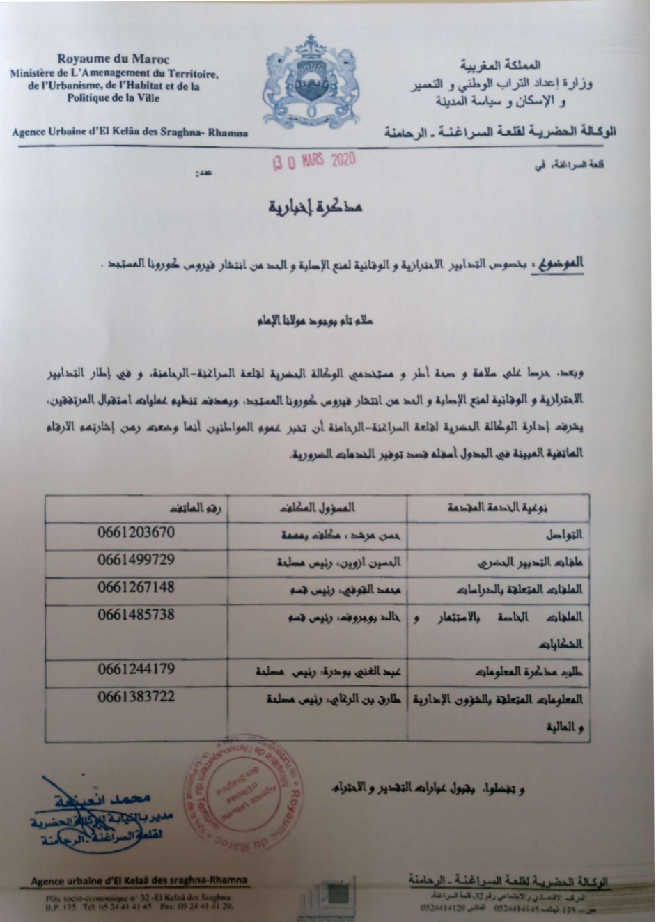 ومواكبة منها لدراسة ملفات الطلبات المتعلقة بالرخص التعميرية، وبتنسيق مع المنظومة المحلية على مستوى إقليم الرحامنة قرر الاستمرار باعتماد تقنية اللجان الإفتراضية للبث في الملفات المعروضة على المنصة الإلكترونية www.rokhas.ma بالنسبة للمشاريع الكبرى والصغرى، والمنصة www.cri.invest.ma بالنسبة للمشاريع الاستثمارية التي تتم دراستها من طرف اللجنة الجهوية الموحدة للاستثمار. كما همت هذه التدابير إحداث لجنة داخلية عهد إليها تتبع وتفعيل جميع الاجراءات المتخذة على مستوى المؤسسة والمتعلقة بعمليات التحسيس والتوعية والحرص على استمرارية عمليات تعقيم المقر الاجتماعي للوكالة بمدينة قلعة السراغنة وملحقتها بمدينة بن جرير. و بذات السياق و حرصا على سلامة و صحة اطر و مستخدمي الوكالة الحضرية لقلعة السراغنة-الرحامنة،و في إطار التدابير الوقائية لمنع الإصابة و الحد من انتشار فيروس كورونا المستجد،و بهدف تنظيم عمليات استقبال المرتفقين،يشرف إدارة الوكالة الحضرية لقلعة السراغنة-الرحامنة ،ان تخبر عموم المواطنين أنها وضعت رهن اشارتهم الارقام الهاتفية المبينة في الجدول اسفله قصد توفير الخدمات الضرورية.