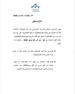 ينهي الصندوق الوطني للضمان الاجتماعي الى علم المقاولات المتأثرة بالازمة الناجمة عن جائحة covid-19 ،انه طبقا للمقتضيات التي جاء بها المرسوم2.20.331 ،يمكن لهم القيام عبر بوابة covid19.cnss.ma خلال الفترة الممتدة من 16ماي الى 3يونيو2020 ، بالاجراءات التالية :