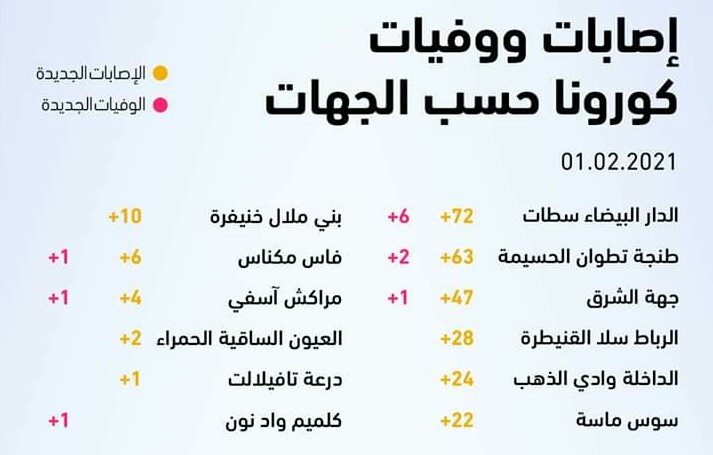أوضحت وزارة الصحة، اليوم الاثنين 21.فبراير 2021 ، عن تسجيل 281 إصابة جديدة بفيروس كورونا المستجد (كوفيد-19) و892 حالة شفاء، و12 حالة وفاة خلال الـ24 ساعة الماضية. كما اشارت الوزارة في النشرة اليومية لنتائج الرصد الوبائي لـ(كوفيد-19)، أن الحصيلة الجديدة رفعت العدد الإجمالي لحالات الإصابة المؤكدة بالمملكة إلى 471 ألف و438 حالة منذ الإعلان عن أول حالة في 2 مارس الماضي، ومجموع حالات الشفاء التام إلى 450 ألف و52 حالة، بنسبة تعاف تبلغ 95.5 في المائة، فيما ارتفع عدد الوفيات إلى 8287 حالة، بنسبة فتك قدرها 1,8 في المائة. وحسب المصدر نفسه  فإن عدد المستفيدات والمستفيدين من التلقيح قد بلغ 200 ألف و81 شخصا.