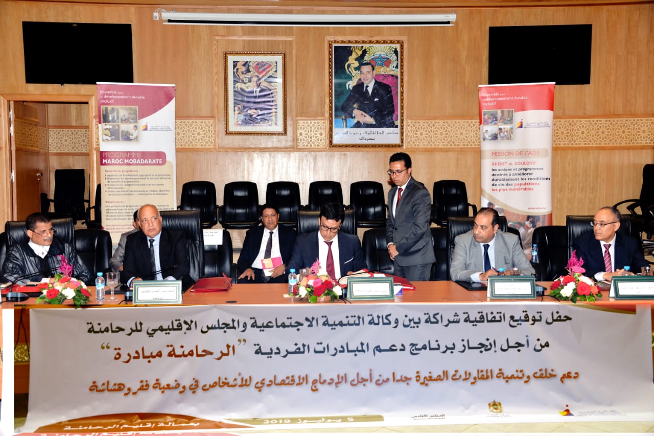 الشراكةوالتعاون من دعائم وكالة التنمية الاجتماعية ، ولهذه الغاية نظمت هذه المؤسسة مساء الجمعة 5 يوليوز2019 بقاعة الندوات بعمالة الرحامنة حفلا ،بشراكة مع عمالة اقليم الرحامنة ، والمجلس الاقليمي للرحامنة، لتوقيع اتفاقية الشراكة المتعلقة ببرنامة “الرحامنة مبادرة” ، الحفل ترأسه عامل اقليم الرحامنة “عزيز بوينيان ” والمدير العام للوكالة وفعاليات الاقليم ،وتسعى الاتفاقية الى ترسيخ عدة اهدف اهمها : دعم المبادرات الفردية للاشخاص في وضعية هشة ،إحداث فضاء للاعلام والاستقبال والتوجيه لاصحاب المشاريع ، مواكبة المقاولة الصغيرة جدا عبر التتبع والارشاد والتحفيز ، تقديم قروض مسترجعة لحاملي المشاريع بدون ضمانة وبدون فائدة ،المساواة في الولوج الى خدمات الفضاء بين الرجال والنساء ،واحقاق مبدأ المناصفة في التمويل والتتبع ، مع مراعاة الاشخاص في وضعية اعاقة. ومن اجل رفع التحديات التنموية باقليم الرحامنة ، فإن اتفاقية اليوم هي ثمرة لتنزيل البرامج الهادفة والناجعة وخلق دينامية وتواصل بين الفاعلين في ميدان التعاون والمقاولة المحلية التي هي في طور التكوين والانطلاق .