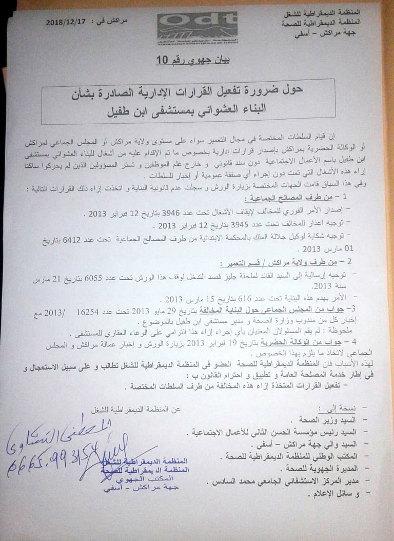 إن قيام السلطات المختصة في مجال التعمير سواء على مستوى ولاية مراكش أو المجلس الجماعي لمراكش أو الوكالة الحضرية بمراكش بإصدار قرارات إدارية بخصوص ما تم الإقدام عليه من أشغال للبناء العشوائي بمستشفى ابن طفيل باسم الأعمال الاجتماعية دون سند قانوني و خارج علم الموظفين و تستر المسؤولين الذين لم يحركوا ساكنا إزاء هذه الأشغال التي تمت دون إجراء أي صفقة عمومية أو إخبار للسلطات .