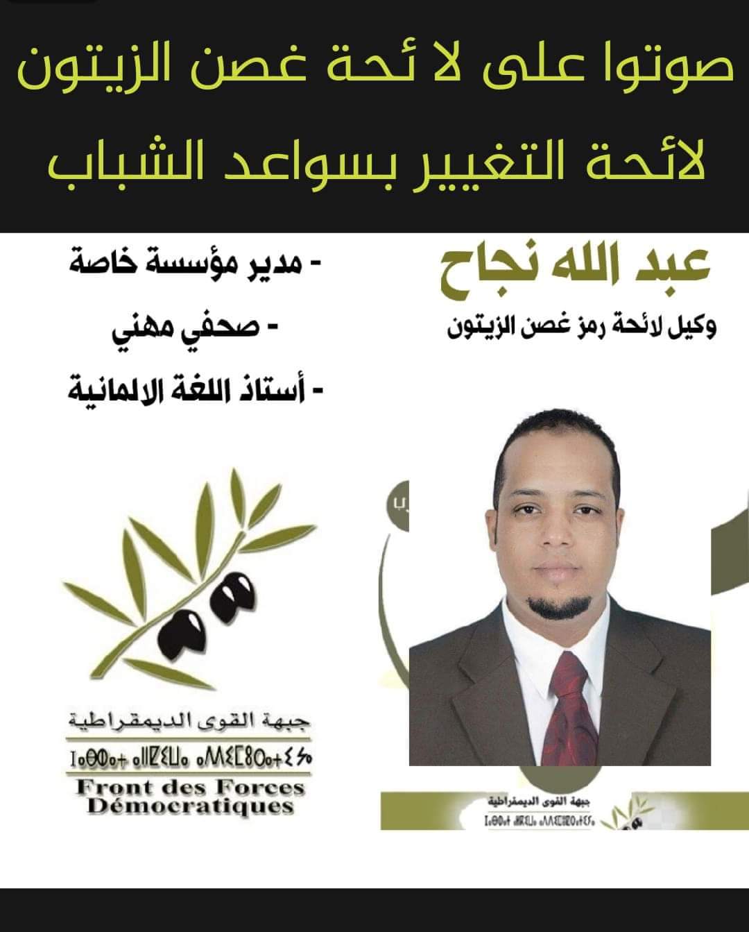 الشاب عبد الله نجاح من اصول رحمانية ، ابا عن جد ، اكمل دراسته بالمانيا ، وعاد منذ سنوات الى بلاد ابائه واجداده محملا بثقافة واسعة ، حيث اقام مشروعا سمي بمركز “كوديكس “للغات ،بمدينة ابن جرير ، الشاب عبدالله يدخل غمار الانتخابات الجماعية ل 8شتنبر2021 بمدينة ابن جرير ، باسم حزب جبهة القوى الديمقراطية رمز “الزيتونة ” وكله طموح وعزيمة فولادينة لاتلين ولاتخضع لاحد ، اتزانه السيكولوجي جعله يركب المنى وينسى الحذر ، وصفاته الحميدة، وورعه اهله بقوة ان يقود لائحة الزيتونة كوكيل لها رفقة شباب عصامي همه الوحيد هو العيش الكريم وصحة وحكامة إدارية وتعليم مجاني ، حملة عبد نجاح جابت أزقة ودروب المدينة زنقة زنقة ودار دار، وهذا ليس بغريب على هذا الشاب وهو ابن حي شعبي من اقدم أحياء المدينة “دوار اجديد ” حملة ابن الحي الجديد لقيت ترحيبا وتعاطفا منقطع النظير من الساكنة ، على امل الفوز بحصة محترمة من المقاعد والله ولي التوفيق .