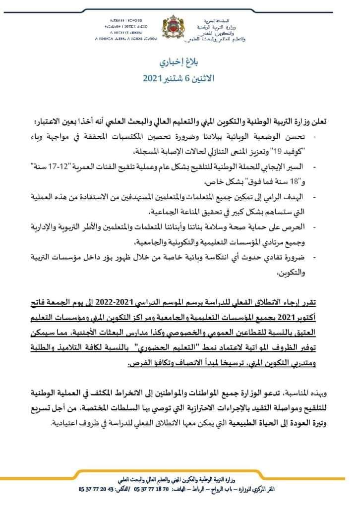 وزارة التربية الوطنية ترجئ الدخول المدرسي الى فاتح اكتوبر 2021 .