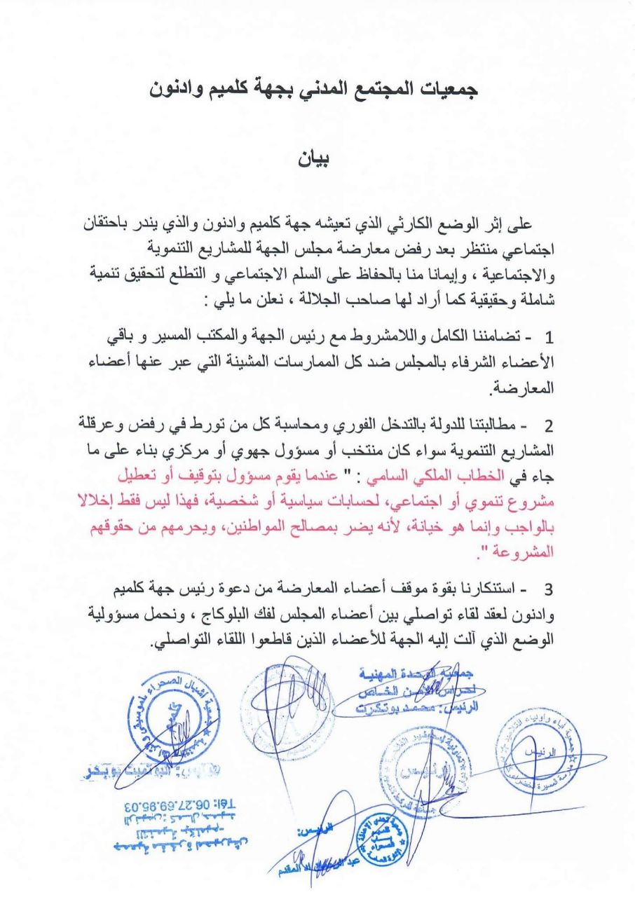 جمعيات المجتمع المدني بجهة كلميم وادنون تصفع “عراب الفساد” وتطالب الدولة بمحاسبة المعارضة وتعلن مساندتها للرئيس عبد الرحيم بوعيدة وبقية الأعضاء الشرفاء بالمجلس.