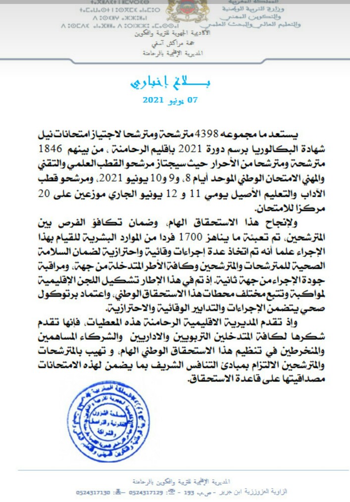 4398 مرشحة ومرشح لاجتياز امتحانات نيل شهادة الباكالوريا 2021 باقليم الرحامنة.